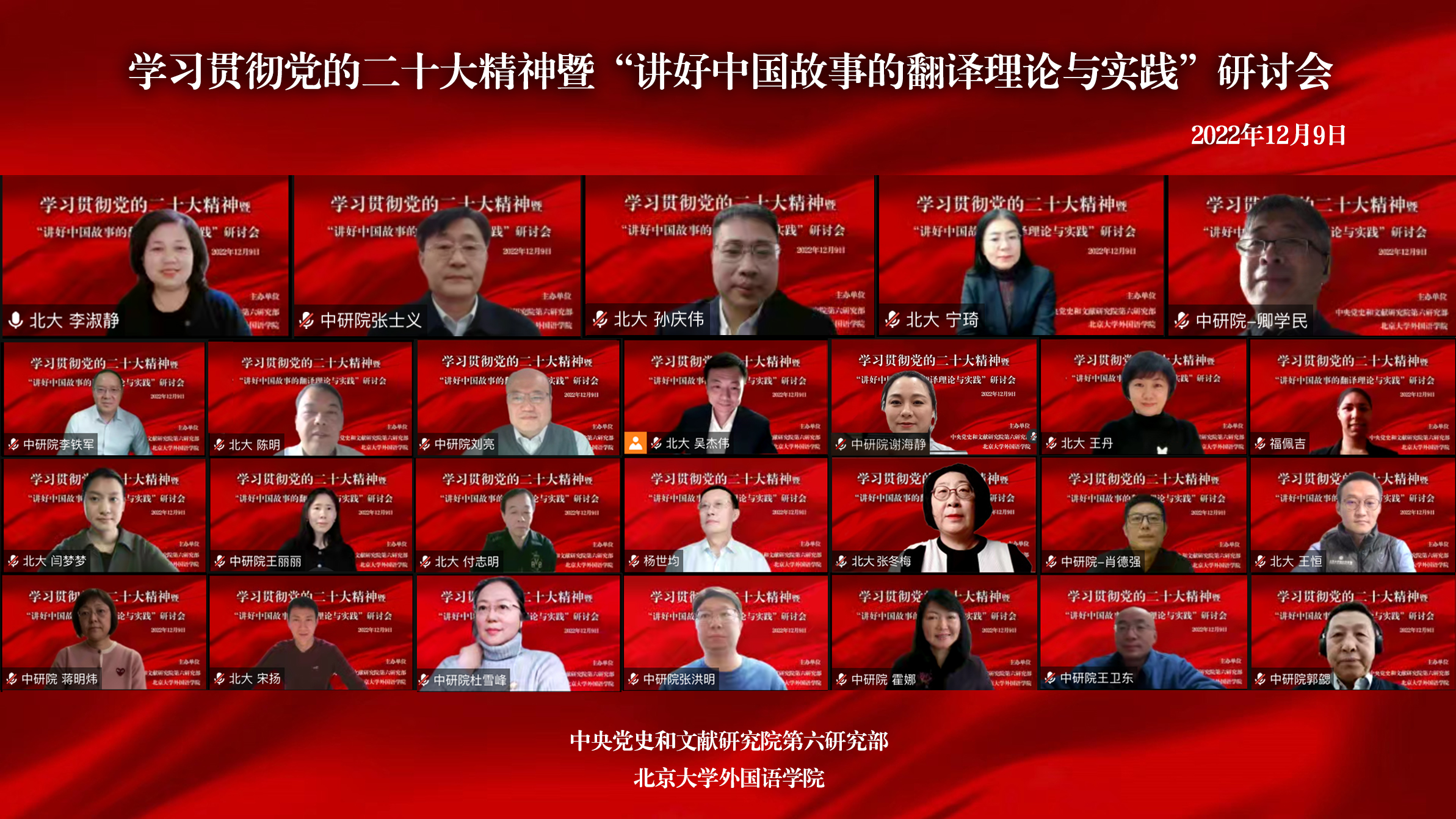为深入学习贯彻党的二十大精神,加强国际传播能力建设和高端翻译人才培养,中央党史和文献研究院第六研究部与3003新葡平台登录入口联合举办了学习贯彻党的二十大精神暨“讲好中国故事的翻译理论与实践”研讨会。会议于12月9日下午在线上举行。中央党史和文献研究院第六研究部主任张士义,3003新葡平台登录入口党委常委、副校长孙庆伟,3003新葡平台登录入口党委副书记、副校长宁琦,3003新葡平台登录入口院长陈明等出席会议。3003新葡平台登录入口党委书记李淑静主持开幕式。中央党史和文献研究院第六研究部全体在职人员和外国专家、3003新葡平台登录入口师生共160余人相聚云端。