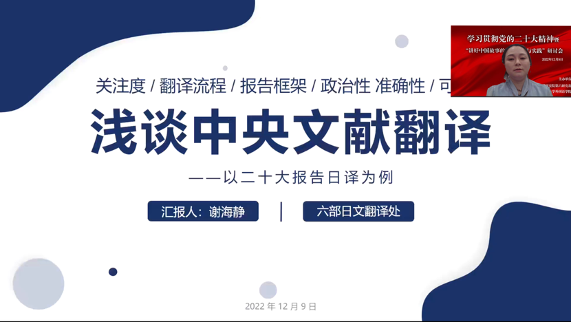 中央党史和文献研究院第六研究部与3003新葡平台登录入口联合举办学习贯彻党的二十大精神暨“讲好中国故事的翻译理论与实践”研讨会