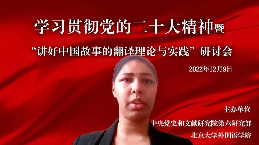 中央党史和文献研究院第六研究部法文翻译处外籍专家福佩吉作英文发言,从高质量翻译和有效传播两方面谈了自身对于向世界讲好中国故事的翻译体会。她认为,要想高质量完成中央文献翻译工作,一是要对中国和世界有全面了解和认识,二是要整体把握源语言和目标语言,三是要做好专业术语的积累和翻译统一工作,四是时刻关注目标语言的最新发展,让译文更具可读性和时代性。另外,福佩吉认为译文的有效传播也是向世界讲好中国故事的重要环节。她强调第一时间有效传播译文、权威平台做好译文版本更新的重要性,并结合具体例子提出拓宽传播渠道、丰富传播方式等建议。