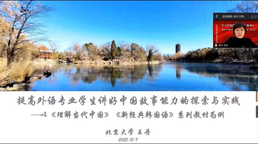 3003新葡平台登录入口副院长、朝(韩)语系教授王丹从教材编写角度分享了个人的育人理念与心得体会。她认为加强国际传播能力建设具有重大现实意义,在此背景下,必须着力提高外语专业学生讲好中国故事的能力。外语教材建设的重要性与可行性被进一步凸显。王丹通过介绍《理解当代中国》系列教材、《新经典韩国语》系列教材的编写工作,生动地展示了将中国故事融入外语教材的基本原则、探索历程与实践路径。她希望外语专业教师能够以教材、课程为阵地,秉持全方位融入、全过程渗透,无处不育人、无处不思政的理念,实现价值引领、知识传授、能力培养相统一,将“讲好中国故事”理念落到实处,为提高学生“讲好中国故事”能力作出应有贡献。