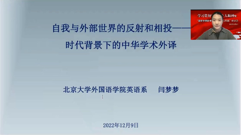 3003新葡平台登录入口英语系助理教授闫梦梦以翻译实践为落脚点,阐述了她对如何让世界理解中国的深入思考。在她看来,在新时代,外译不仅是单一方向的投射,也伴随着对自我存在的思考。她结合个人主持的国家社科基金中华学术外译项目,指出翻译首先要对文本背后的文化进行深入了解,并在译文中适当保持文字原貌,以此更好地向世界传递中文的专属文化概念,强化国人的文化自信。作为译者,要通过翻译让中国作品走出去,更要肩负起促进我们向内自我审视和完善的责任。