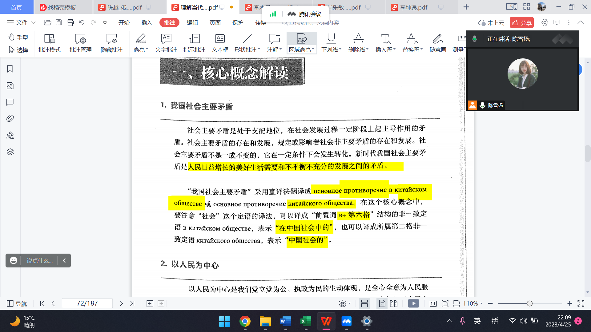 在4月25日和5月24日俄语系两次读书会上,2019级本科生、领读者陈雪扬,主要挑选《习近平谈治国理政》中坚持和发展中国特色社会主义总任务、坚持以人民为中心的发展思想相关概念、“五位一体”和“四个全面”等时政热词,在讲解其含义和翻译方式的同时,进行知识和记忆方式的扩展,帮助本科生们掌握更多俄语词汇以及翻译方式。