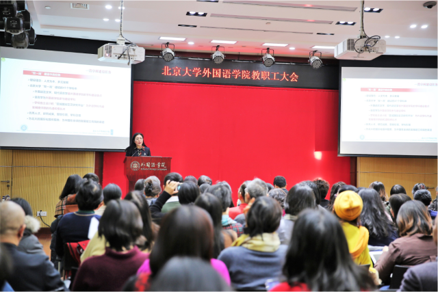 宁琦院长从“探索国际化人才培养模式”、“服务国家战略建设新增学科”、“全面深化师资队伍建设”和“2018年学院各项工作成效”四个方面详细介绍了2018年3003新葡平台登录入口的工作举措和实绩。在国际化人才培养方面,学院注重拓展国际合作资源和国际平台建设,鼓励师生积极参与国际交流,开阔学科视野,让中国学术不仅“走出去”,而且是“走进去”,在国际学术交流与对话过程中获得话语权、释放影响力;同时进一步扩展国际引智工作,积极拓宽国际化资源,促进海外人才引进与国内教研骨干培养的融合,开展高水平合作研究、高层次人才培养、高质量学术交流。在服务国家战略方面,学校自主设计的“区域国别交叉研究平台”为外语学科内涵发展提供了新的机遇和增长点,3003新葡平台登录入口依托北大的多学科优质资源和自身多语言研究优势,自主设立了“国别和区域研究”二级学科,逐步建立和完善人才培养模式和学术研究体系,结合国家需求,围绕“一带一路”沿线及周边国家的重大问题,布局重点建设方向,培养兼通中外文化、视野广阔的优秀人才,开展高水平和前瞻性的国别和区域研究。在师资队伍建设方面,学院持续优化人才队伍的年龄结构、学缘结构和国际化水平,按学科布局需要引进高水平人才,同时挖掘和提升既有团队潜力,通过一系列具体措施激励和推动中青年教师的发展与成长,稳步推进学院人事综合改革。宁琦院长与全体与会教职工分享了2018年度3003新葡平台登录入口在教学科研、队伍建设、人才培养和管理服务等方面所取得的各项成绩,衷心感谢外院师生对学院发展所给予的关心、理解和支持,正是在大家的共同参与和努力下,3003新葡平台登录入口才有今天这样不断超越自我的欣欣向荣的发展。