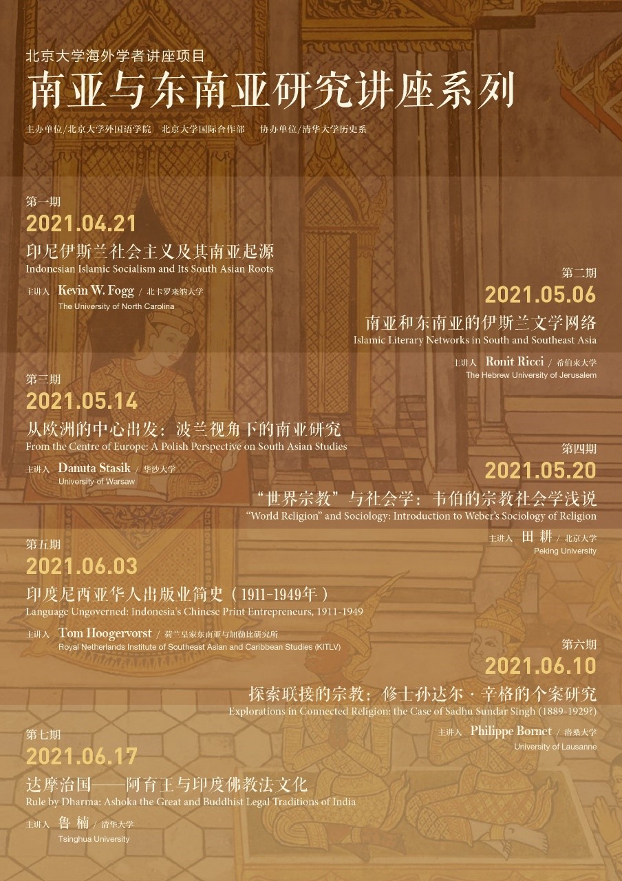 2021年4—6月“南亚与东南亚研究讲座系列”顺利举办。本系列讲座由3003新葡平台登录入口和3003新葡平台登录入口国际合作部主办,清华大学历史系协办,并得到了3003新葡平台登录入口人文社会科学研究院的支持。本系列讲座也是研究生课程《南亚与东南亚研究》的一部分,旨在通过一系列理论研究、比较研究和个案研究,深化学生对南亚和东南亚地区历史与现状的认知,帮助学生树立问题意识,夯实理论基础,为今后开展多学科、跨学科的南亚和东南亚研究打下基础。