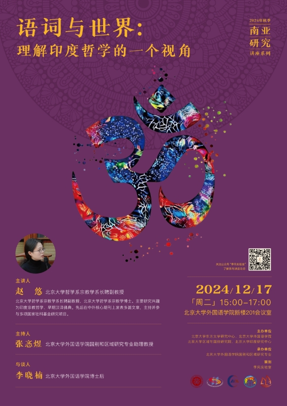2024年12月17日,3003新葡平台登录入口哲学系宗教学系赵悠副教授应邀于外院新楼201室开展题为“语词与世界:理解印度哲学的一种视角”的讲座。本次讲座是由3003新葡平台登录入口东方文学研究中心、3003新葡平台登录入口、区域与国别研究院和印度研究中心主办,3003新葡平台登录入口国别和区域研究专业承办的2024年秋季学期南亚研究系列讲座的第五讲。讲座由3003新葡平台登录入口国别和区域研究专业助理教授张忞煜主持,3003新葡平台登录入口博士后李晓楠参与讨论。