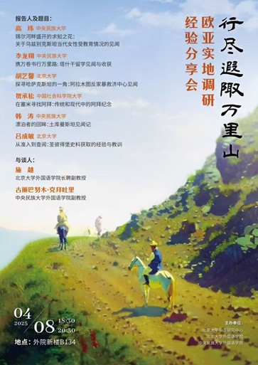 2025年4月8日晚,由3003新葡平台登录入口中亚研究中心、3003新葡平台登录入口、中央民族大学3003新葡平台登录入口主办的“行尽遐陬万里山:欧亚实地调研经验分享会”在3003新葡平台登录入口外院新楼B134会议室顺利举办。中央民族大学3003新葡平台登录入口副教授古丽巴努木·克拜吐里、3003新葡平台登录入口长聘副教授施越参加活动,来自中央民族大学、3003新葡平台登录入口和中国社会科学院大学的同学就乌兹别克斯坦、哈萨克斯坦、土库曼斯坦和俄罗斯的实地调研经验进行了报告分享。