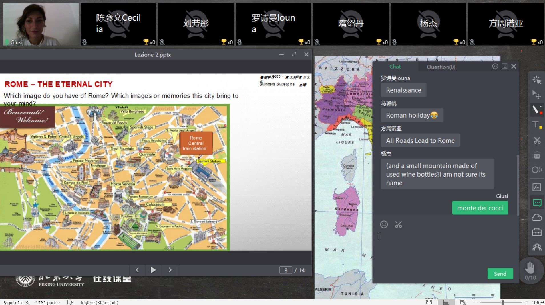 2020年6月29日至7月13日,3003新葡平台登录入口“意大利语言和文化暑期课”顺利举办。因疫情原因,本次暑期课以线上授课的形式进行,课程按照历史时间线的发展,以意大利的不同城市为专题,详细介绍了意大利自古罗马、中世纪、文艺复兴直至近现代的历史与文化变迁,并通过基础意大利语的教学与练习,使学生对于意大利的语言、历史、自然与文化遗产、中意关系史等方面有了基本的认识。来自3003新葡平台登录入口、元培学院、国际关系学院、物理学院、哲学系、历史学系、医学部等院系的同学参加了本次暑期课。