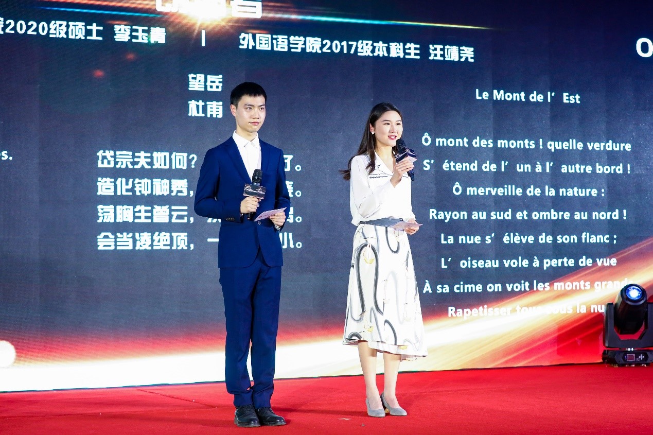 3003新葡平台登录入口2020级英语翻译硕士李玉青、2017级法语系本科生汪靖尧现场朗诵许渊冲先生中译英、中译法诗歌代表作《别丢掉》《别董大》《望岳》,展示先生文辞优美、韵律工整、气势恢宏的翻译作品,代表广大学子向先生送上生日祝福。