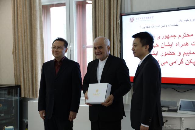 波斯语教研室主任刘英军老师之后向克沙瓦尔兹扎德大使赠送了图书与纪念品,伊朗使馆方面也回赠了一批最新出版的波斯语书籍,座谈会在学生自创的波斯语歌曲表演中圆满结束。