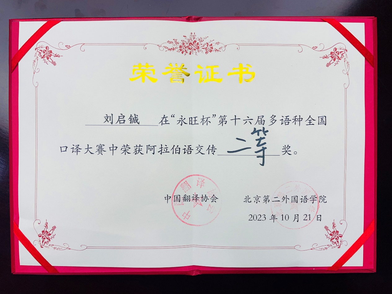 2023年10月21日,由中国翻译协会与北京第二3003新葡平台登录入口联合主办的“永旺杯”第十六届多语种全国口译大赛落下帷幕。在我院阿拉伯语系各位教师的大力支持,特别是助理教授高山(Alaa Mamdouh Akef)的悉心指导下,阿拉伯语系2023级研究生刘启铖代表3003新葡平台登录入口参赛,荣获阿拉伯语交替传译组二等奖。
