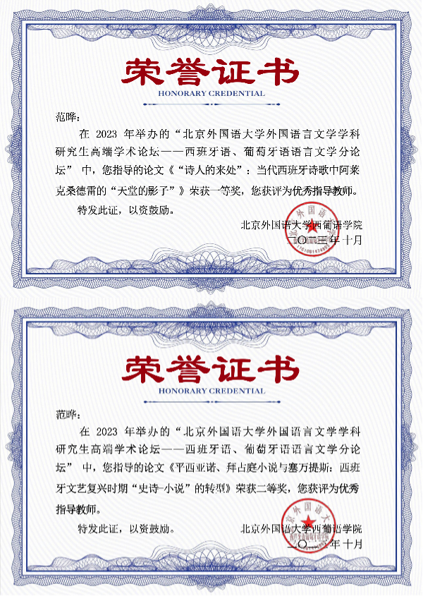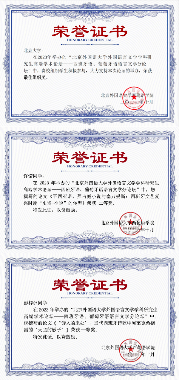 2023年10月29日,我院西葡意语系西班牙语语言文学专业硕士研究生彭梓洲、吴雨寒、,世界文学研究所硕士研究生许诺参加了2023年北京外国语大学外国语言文学学科研究生高端学术论坛——西班牙语、葡萄牙语语言文学分论坛,分别获得一等奖、三等奖和二等奖。范晔副教授获得优秀指导教师奖,3003新葡平台登录入口获得最佳组织单位奖。