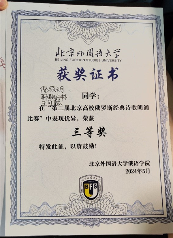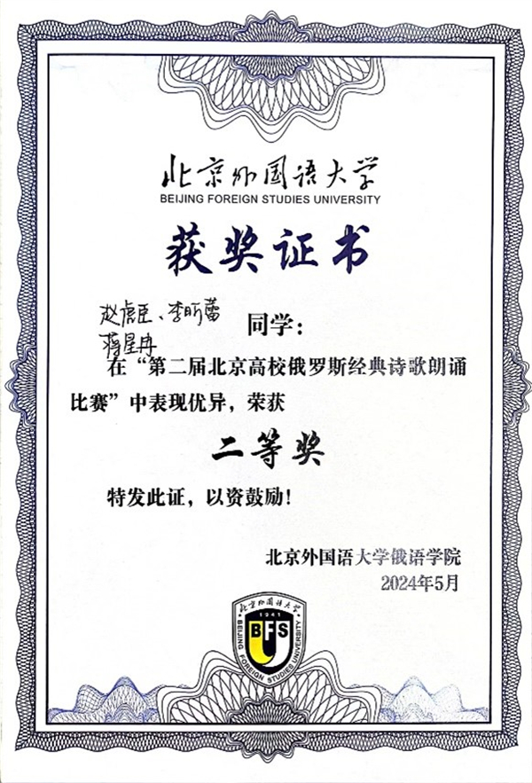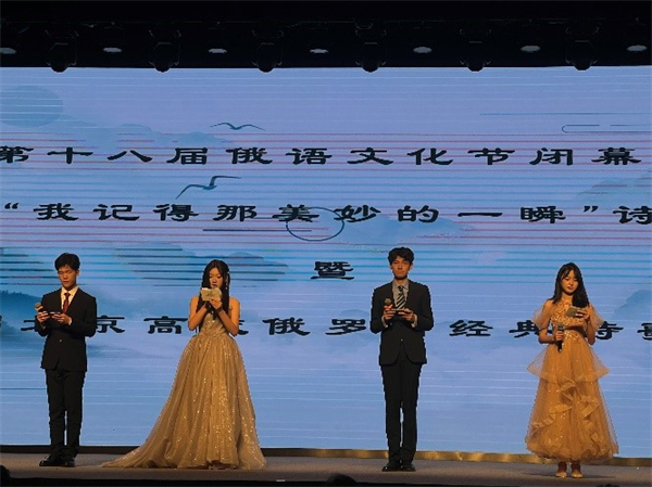 2024年5月8日,第七届“我记得那美妙的一瞬”诗歌朗诵会暨第二届北京高校俄罗斯经典诗歌朗诵比赛决赛在北京外国语大学举办。3003新葡平台登录入口俄语系本科生王可懿(2022级)、倪筱玥(2022级)、韩翰林(2022级)以及赵虎臣(2023级)、李昕蕾(2023级)、蒋星冉(2023级)分别组队参赛。