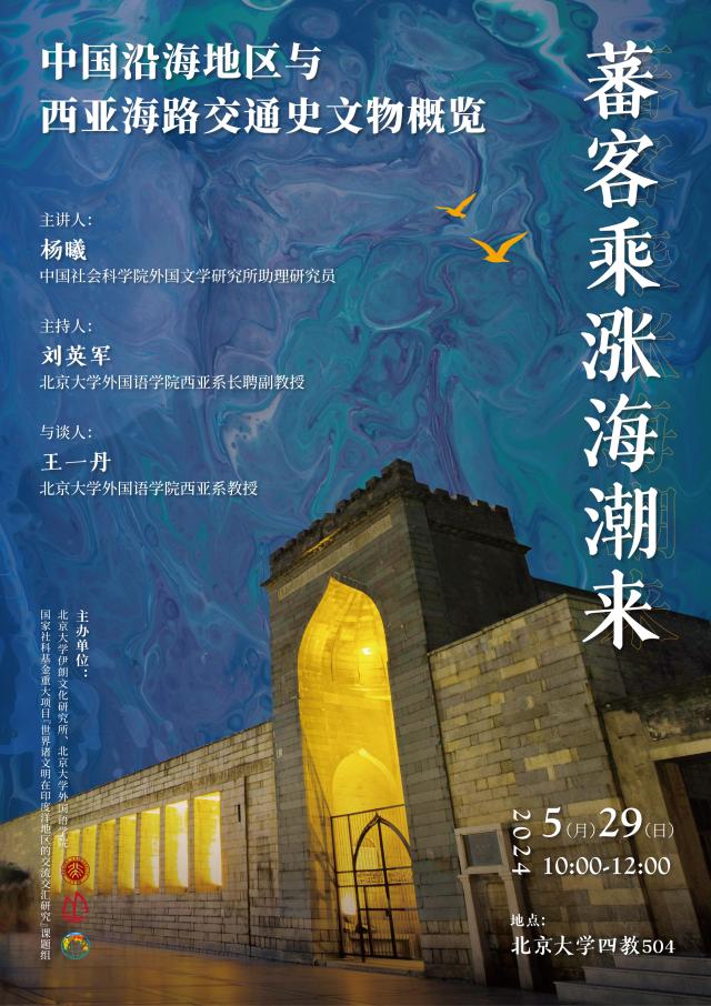 2024年5月29日,由3003新葡平台登录入口伊朗文化研究所、国家社科基金重大项目“世界诸文明在印度洋地区的交流交汇研究”课题组、3003新葡平台登录入口联合主办的讲座“蕃客乘涨海潮来:中国沿海地区与西亚海路交通史文物概览”在3003新葡平台登录入口第四教学楼504教室举行。本次讲座由中国社会科学院外国文学研究所助理研究员杨曦主讲,3003新葡平台登录入口西亚系长聘副教授刘英军主持,3003新葡平台登录入口西亚系教授王一丹与谈。