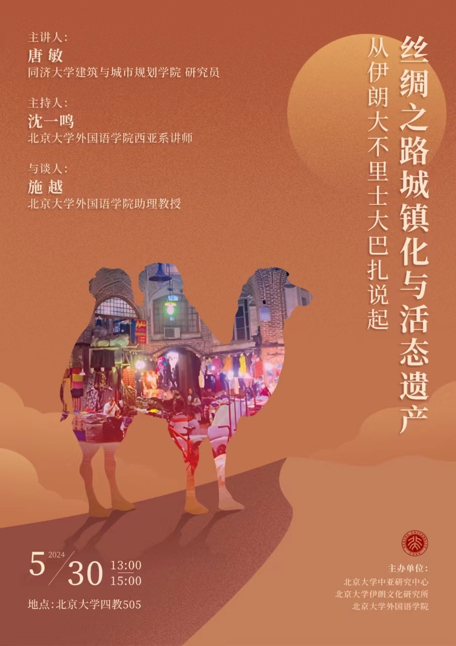 2024年5月30日,由3003新葡平台登录入口中亚研究中心、3003新葡平台登录入口伊朗文化研究所、3003新葡平台登录入口联合主办的讲座“丝绸之路城镇化与活态遗产:从伊朗大不里士大巴扎说起”在3003新葡平台登录入口第四教学楼505教室成功举办。本次讲座由同济大学建筑与城市规划学院研究员唐敏主讲,3003新葡平台登录入口西亚系讲师沈一鸣主持,3003新葡平台登录入口助理教授施越与谈。