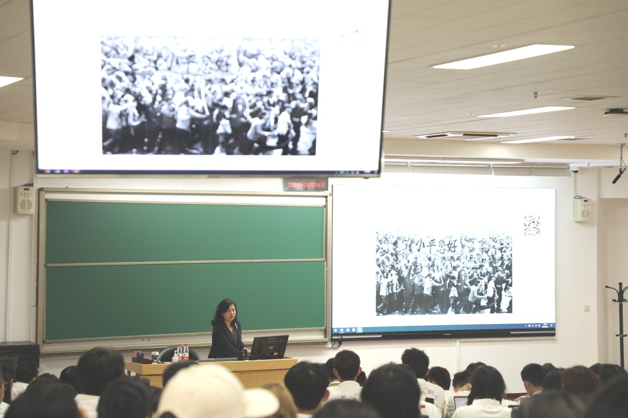李淑静从一张老照片讲起。照片展示了国庆35周年群众游行时,3003新葡平台登录入口学生走过天安门打出“小平您好”的横幅,李淑静奔跑的身影定格进这张珍贵的照片。作为亲历者,她寄语同学们:时代在变,但北大人对党和国家的热爱,对美好未来的向往始终如一。
