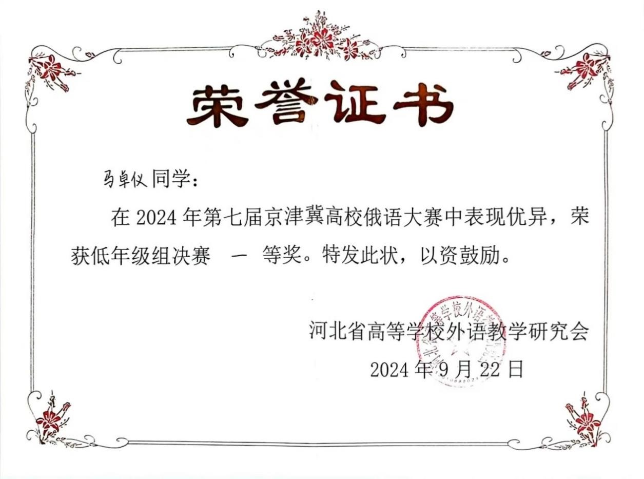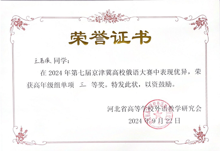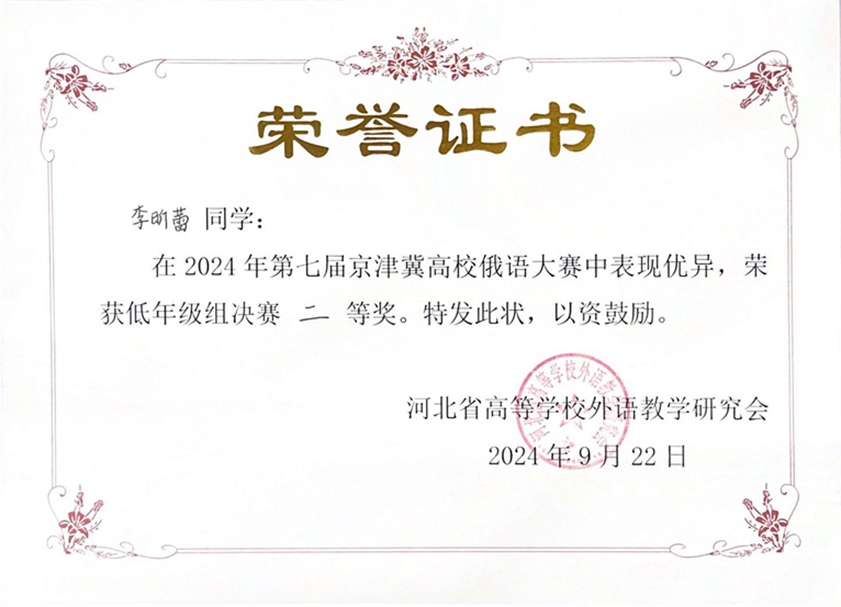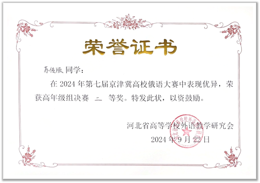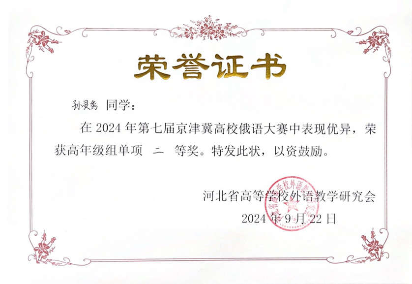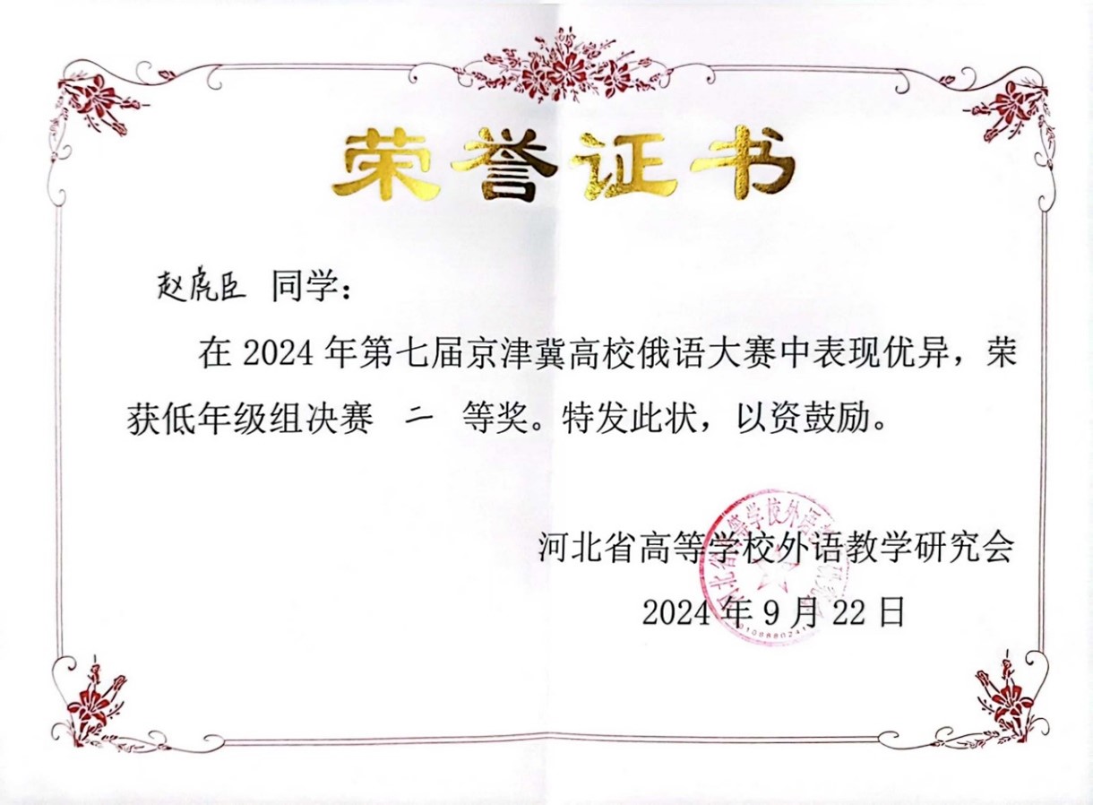 2024年9月21日至22日,由河北省高等学校外语教学研究会主办,河北师范大学3003新葡平台登录入口承办的第七届京津冀高校俄语大赛顺利举办。3003新葡平台登录入口俄语系本科生苏传顺(2021级)、孙灵秀(2022级)、王若溪(2022级)以及李昕蕾(2023级)、马卓仪(2023级)、赵虎臣(2023级)分别参加了高年级与低年级两个组别的比赛,由陈松岩担任带队老师,在黄颖老师、尹旭老师与外教叶莲娜·瓦列里耶芙娜(Елена Валерьевна)等俄语系教师的精心辅导下,俄语系所有参赛选手均取得了优异成绩。马卓仪获一等奖,李昕蕾、苏传顺、赵虎臣获二等奖,孙灵秀获演讲单项二等奖,王若溪获演讲单项三等奖。