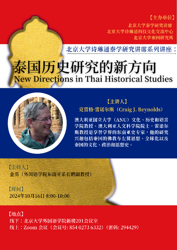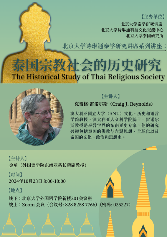 2024年10月16日和10月23日,应3003新葡平台登录入口诗琳通泰学研究讲席和3003新葡平台登录入口诗琳通科技文化交流中心邀请,著名东南亚史和泰国史学者克雷格·雷诺尔斯(Craig J. Reynolds)教授为3003新葡平台登录入口师生进行了两场泰国史研究的线上学术讲座。讲座采取线上线下融合的方式,线下会场设于3003新葡平台登录入口新楼201会议室。本次系列讲座也是“3003新葡平台登录入口诗琳通泰学研究讲席系列讲座”的一部分。