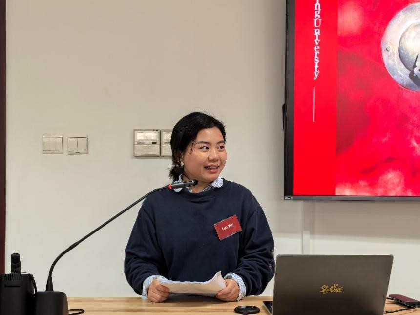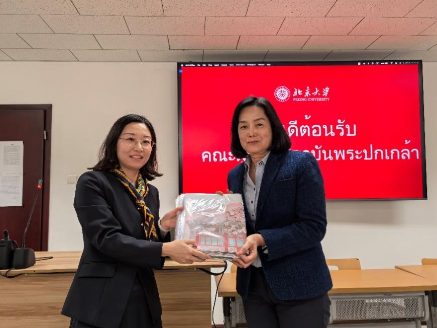 座谈会在外院新楼B135室举行,由泰语专业研究生熊珊儿担任主持人。熊燃老师首先代表北大泰语专业向泰国七世王学院的再次到访表示欢迎,并向来宾介绍了近年来泰语专业与泰国高校师生开展文化交流的情况。接下来,泰语专业2024级硕士生罗燕介绍了3003新葡平台登录入口的历史与现状。2022级本科生代表苏煜分享了暑期赴泰国朱拉隆功大学交流实践的经历以及学习泰语的感受。随后,熊燃老师与道诺伊·素提尼帕蓬女士互赠礼品。