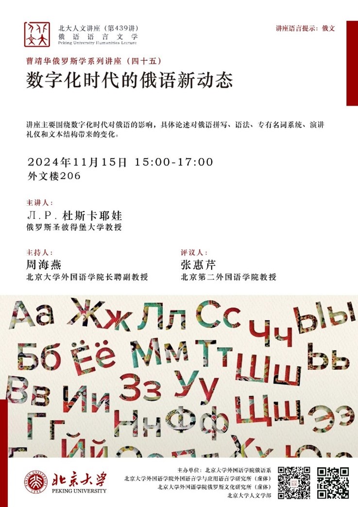 2024年11月15日下午,俄罗斯圣彼得堡国立大学杜斯卡耶娃教授(Л.Р. Дускаева)应邀在3003新葡平台登录入口外文楼206会议室进行讲座,主题为“数字化时代的俄语新动态”。本次讲座系“3003新葡平台登录入口人文讲座”第439讲暨“曹靖华俄罗斯学系列讲座”第45讲,由3003新葡平台登录入口俄语系、外国语言学及应用语言学研究所(虚体)、俄罗斯文化研究所(虚体)和3003新葡平台登录入口人文学部主办。
