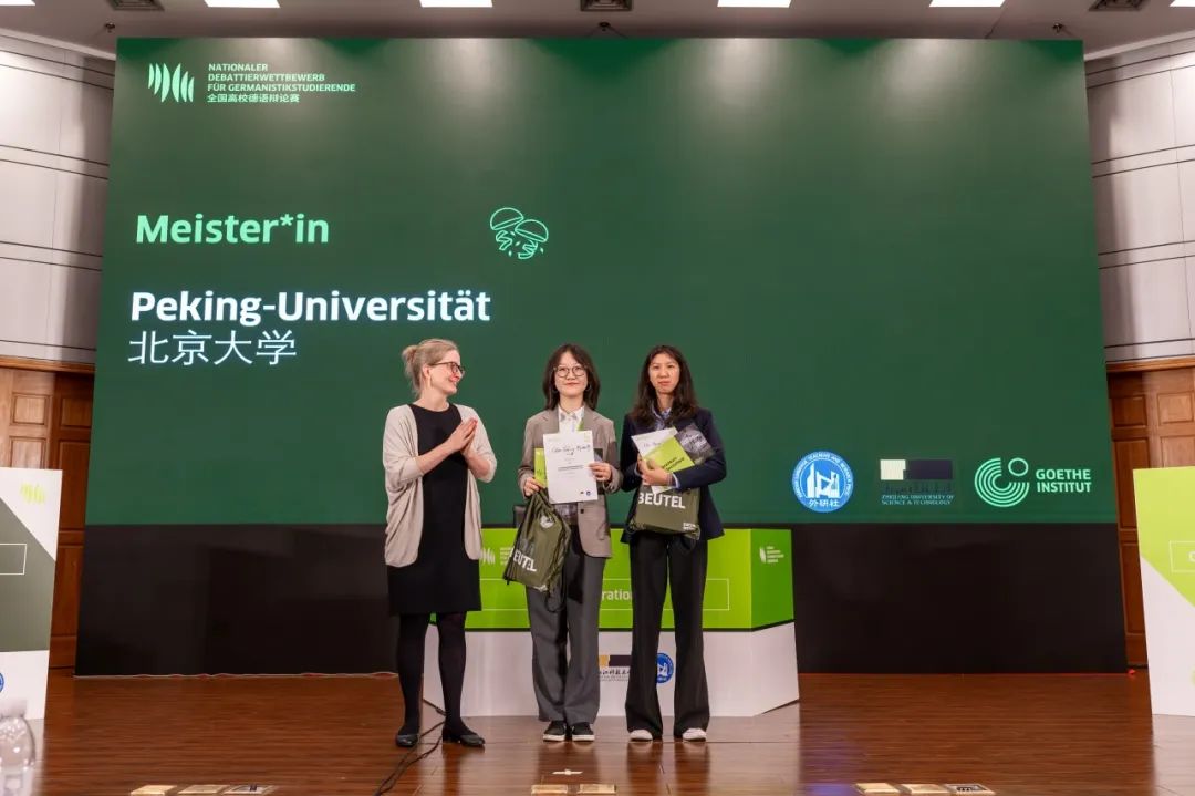 在决赛中,陈雨亭、何海盈两位同学面对大连外国语大学,辩题为“大学本科学习阶段是否必须实习”,北大持正方。两位同学强调学习中理论与实践相结合的必要性,同时指出,通过引入实习要求,学生既能够在实习中运用所学知识、积累经验以适应职场,更能通过实习发现真正的兴趣与志向,避免在不对口而又缺乏认同与热情的工作中被异化。自由辩论阶段,陈雨亭、何海盈不仅很好地回应了反方关于“强制实习加重学生负担”的论点,指出提前接触就业市场有助于提升职业素养、缓解学生焦虑,更突出实习中“知行合一”的论点,将之升华为培养完全人格的教育方法。两位辩手以流利的德语极具说服力地表达了以上论点,最终成功获胜,夺得第十四届全国高校德语系专业大学生德语辩论赛冠军!