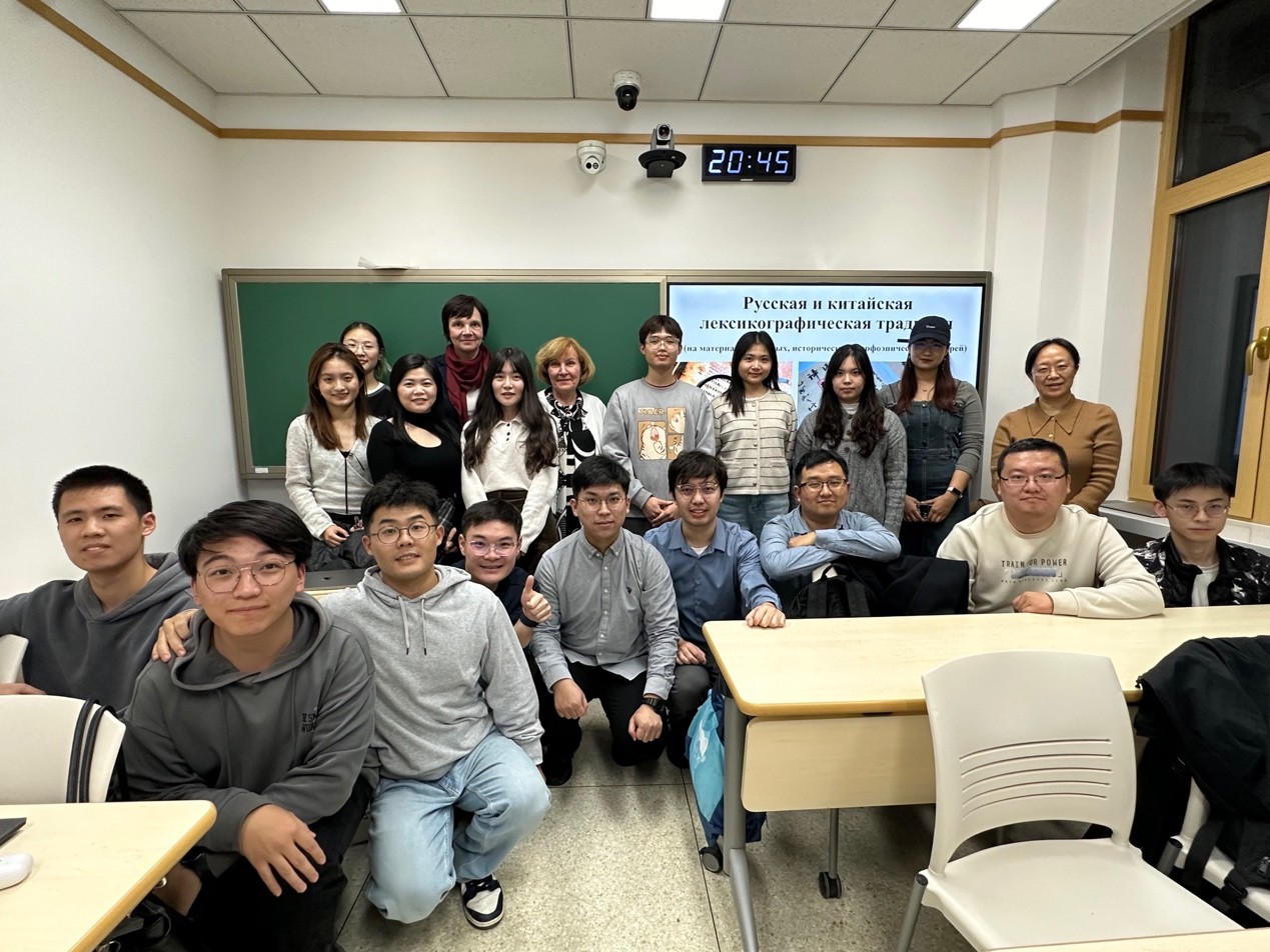 讲座结束后,沃洛申娜副教授回答了听众关于俄语词典编纂以及俄汉词典对比研究的提问。俄语系主任周海燕老师代表俄语系对沃洛申娜副教授为师生带来精彩讲座表示感谢。沃洛申娜副教授和与会师生合影留念,讲座圆满结束。