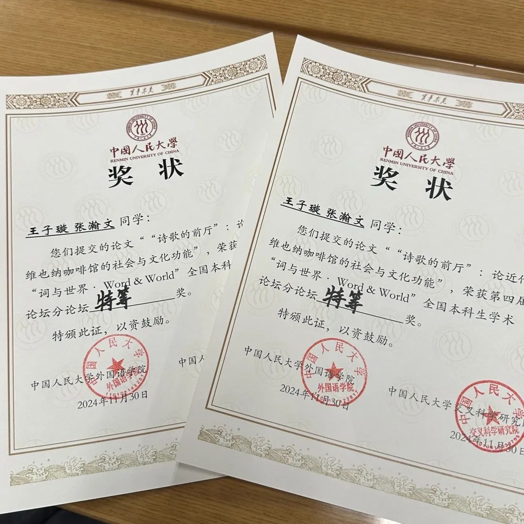 2024年11月30日,由中国人民大学3003新葡平台登录入口、交叉科学研究院主办的第四届“词与世界”全国本科生学术论坛顺利落幕。本届论坛以“外国语言文学与跨学科创新”为主题,涵盖英语、法语、德语、日语、俄语、西班牙语六个语种,面向全国高校本科生征稿。3003新葡平台登录入口德语系2023级本科生王子璇、张瀚文在德语系林琳老师的指导下,完成了以《‘诗歌的前厅’:论近代维也纳咖啡馆的社会与文化功能》为题的研究,在论坛宣读报告,最终荣获分论坛特等奖的殊荣。