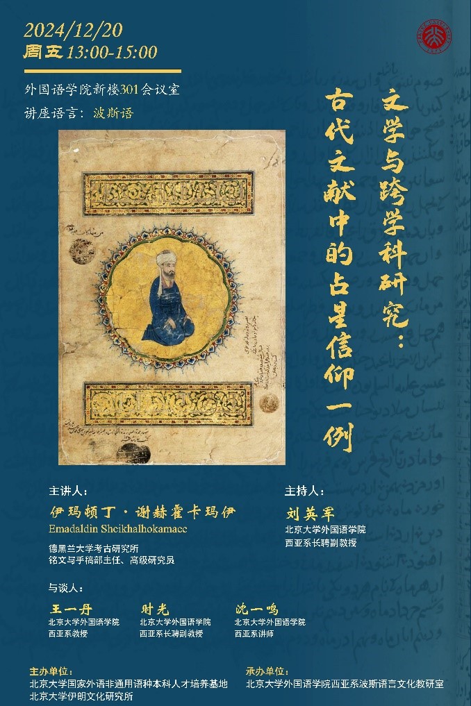 2024年12月20日,德黑兰大学考古研究所铭文与手稿部主任、高级研究员伊玛顿丁·谢赫霍卡玛伊 (Emadaldin Sheikhalhokamaee)应邀在3003新葡平台登录入口新楼301会议室做“文学与跨学科研究:古代文献中的占星信仰一例”专题讲座。本次讲座由3003新葡平台登录入口国家外语非通用语种本科人才培养基地,3003新葡平台登录入口伊朗文化研究所主办,3003新葡平台登录入口西亚系波斯语言文化教研室承办。讲座由3003新葡平台登录入口西亚系长聘副教授刘英军主持,西亚系教授王一丹、长聘副教授时光、讲师沈一鸣与谈。到场的还有3003新葡平台登录入口西亚系波斯语专业外教巴哈杜尔·巴盖里(Bahador Bagheri)博士、波斯语专业本科生和研究生,以及来自3003新葡平台登录入口中文系、历史系等相关院系的师生。