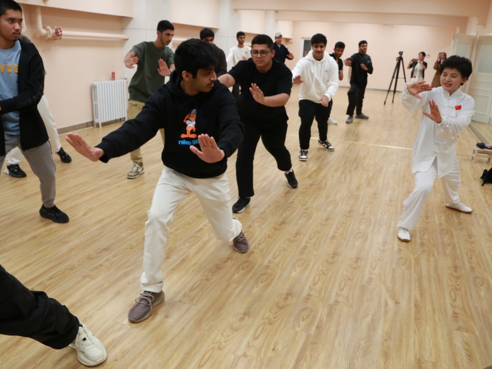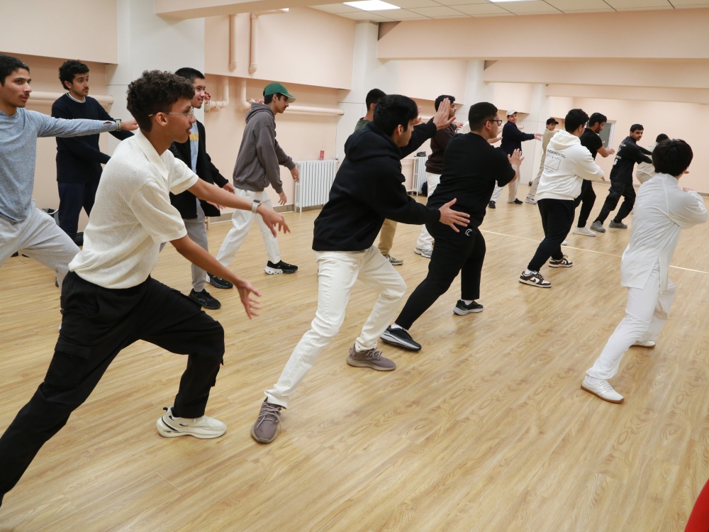 座谈部分结束后,代表团同学们与阿拉伯语系师生共同移步外文楼三层的活动教室,他们在此与太极、乒乓球老师进行短暂的交流学习,亲身感受中国的传统国粹和现代国粹运动。男同学们来到了太极教室。3003新葡平台登录入口体教部王东敏副教授首先介绍了太极的基本动作,让大家对中国传统国粹武术有了基本的了解。接着,教授带领同学们亲自体验了太极动作,切身感受其中传承千年的中国智慧,开拓了体育运动的新视野。