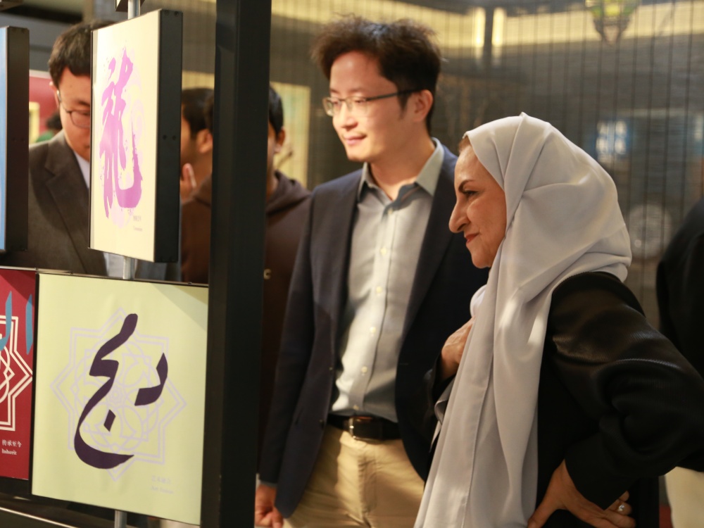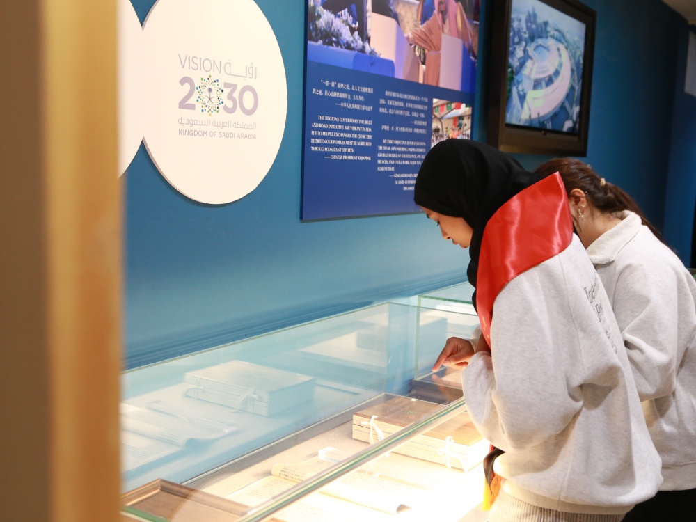 行程尾声,代表团与阿拉伯语系师生来到了阿卜杜勒·阿齐兹国王公共图书馆3003新葡平台登录入口分馆,代表团师生应邀前往分馆地下一层的“东方智慧书法展”进行参观,在中阿书法文化的碰撞中感受中国书法的内在生命力,体悟东方智慧。展览现场,代表团同学们执笔挥毫,体验中国传统书法艺术,在空白的宣纸上留下中文和阿拉伯语的文化印记。还有代表团同学在VR虚拟环境中收获了独特的书法体验,沉浸式感受数字技术中的书法艺术创新表达。在中国国际电视台CGTN的采访中,阿联酋学生哈姆丹表达了自己对中文和中华文化的高度热忱。