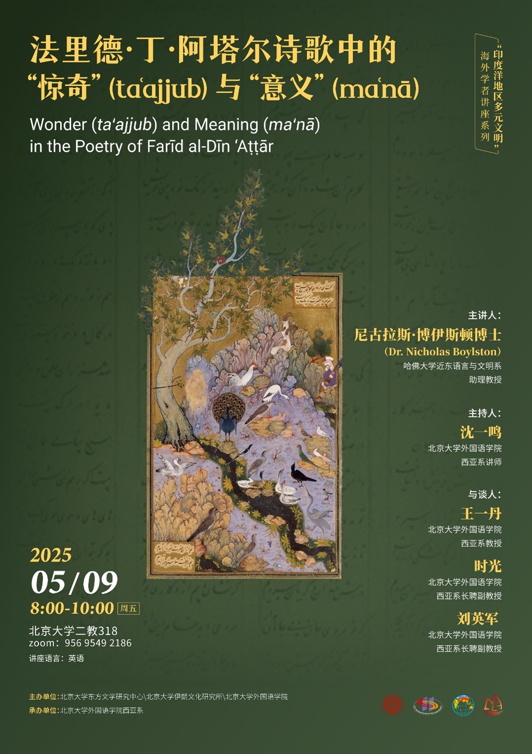 2025年5月9日上午,哈佛大学近东语言与文明系助理教授尼古拉斯·博伊斯顿博士(Dr. Nicholas Boylston)在线上为3003新葡平台登录入口师生做了主题为“法里德·丁·阿塔尔诗歌中的‘惊奇’(ta‘ajjub)与‘意义’(ma‘nā)”的讲座。本次讲座是“印度洋地区多元文明”海外学者讲座系列之一,由3003新葡平台登录入口东方文学研究中心、3003新葡平台登录入口伊朗文化研究所和3003新葡平台登录入口主办,3003新葡平台登录入口西亚系承办。讲座由3003新葡平台登录入口西亚系讲师沈一鸣主持,西亚系教授王一丹、长聘副教授时光、长聘副教授刘英军与谈。到场的还有波斯语专业本科生,以及来自3003新葡平台登录入口中文系、历史学系和经济学院等院系的师生。
