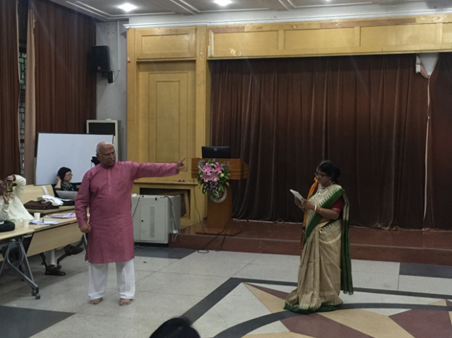 毕业于3003新葡平台登录入口印地语专业的校友,中国的印度舞蹈专家金珊珊女士介绍了她编导泰戈尔《齐德拉》音乐舞蹈史诗剧的经验,并和她的学生们展现了古典印度舞蹈之美。印度国际大学3003新葡平台登录入口院长阿维杰特•森教授(Prof. Abhijit Sen)在他有关泰戈尔戏剧发展史的学术报告中,邀请国际大学艺术家高什夫妇( Avik Ghosh/Ms. Gargi Ghosh)呈现了六部泰戈尔经典戏剧的精彩片段。孟加拉国77岁的资深艺术家阿达乌尔•拉赫曼(Mr. Ataur Rahman)为大会做了“孟加拉国泰戈尔戏剧演出史”的精彩大会发言,并与印度艺术家咖尔吉•高什(Ms. Gargi Ghosh)表演了泰戈尔《红夹竹桃》的精彩片段。《红夹竹桃》是泰戈尔最有代表性的戏剧作品之一,本次演出是该剧在中国的首演,演出剧本改编自3003新葡平台登录入口资深教授刘安武先生的译本,3003新葡平台登录入口 “泰戈尔导读”课程团队参与组织,3003新葡平台登录入口六位学子和玺莹仁剧团联合六位国际友人,插入多语种朗诵片段。与会者认为演出独具特色,创新性地表现了《红夹竹桃》的意义。
