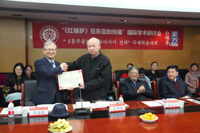 接下来由3003新葡平台登录入口东方文学研究中心主任王邦维教授向崔溶澈教授颁发了“《红楼梦》在东亚的传播”课题负责人聘书。