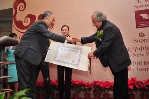 仲跻昆于3003新葡平台登录入口,在第二届中坤国际诗歌奖颁奖典礼上为阿拉伯当代著名诗人阿多尼斯颁奖