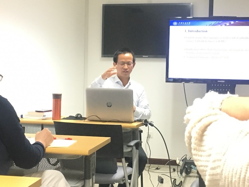 2018年11月23日,上海交通大学杨炳钧教授来3003新葡平台登录入口做语言学沙龙。杨教授的题目为《关于概念语法隐喻的完全体现原则:以名词化为例》(Full realization principle for the identification of ideational grammatical metaphor: nominalization as an example)。本次讲座由语言所副所长高彦梅老师主持。来自语言所和北京其他院校的硕博士研究生和进修教师到场聆听讲座。